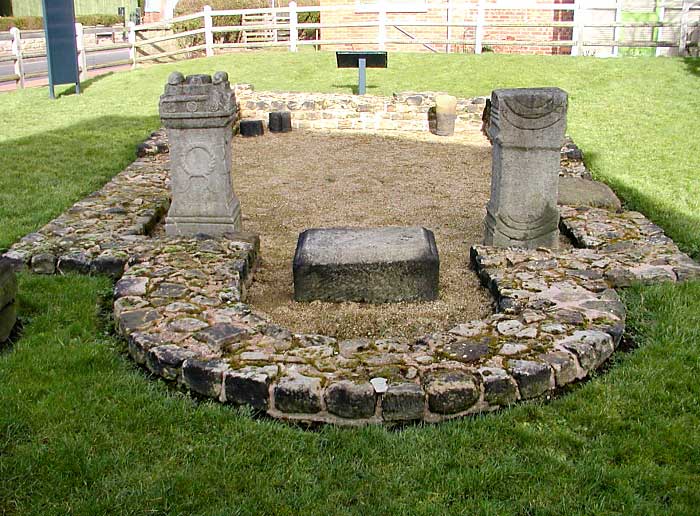 Benwell Roman Temple at Hadrian's Wall, Newcastle upon Tyne, England. The temple would have been sited in the vicus (civil settlement) outside the fort. It can be seen today in Broomridge Avenue. It is a rectangular building of stone measuring 16 x 10feet internally, with an apse at its south end which contained the cult statue of Anenociticus.